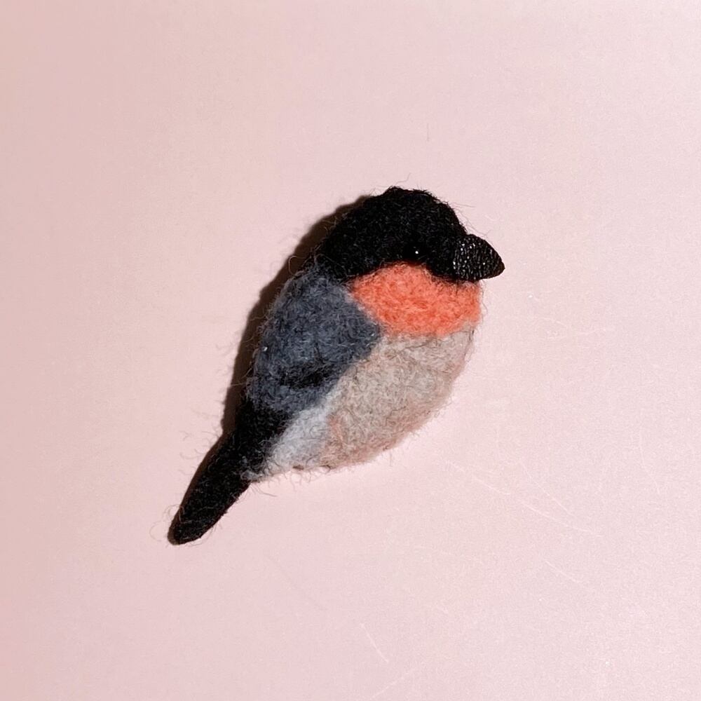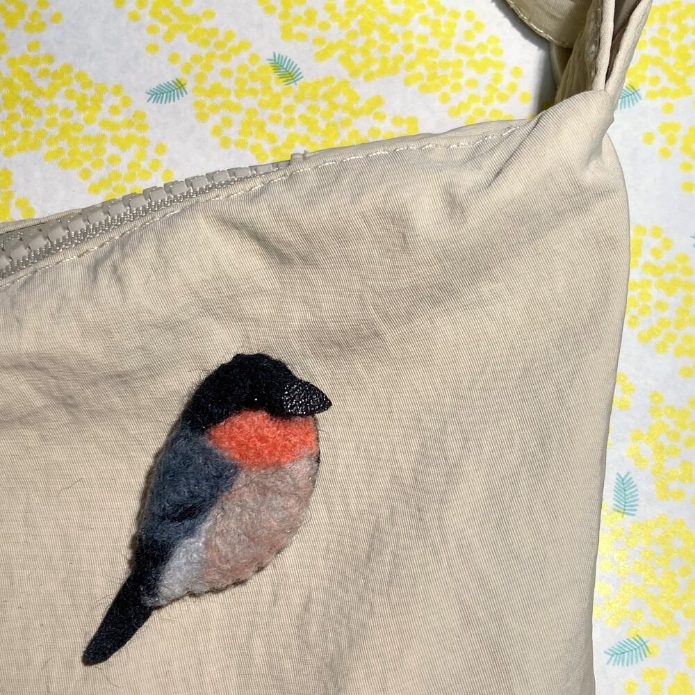 珊瑚色が可愛らしいむっちりしたウソのブローチを制作してみました。